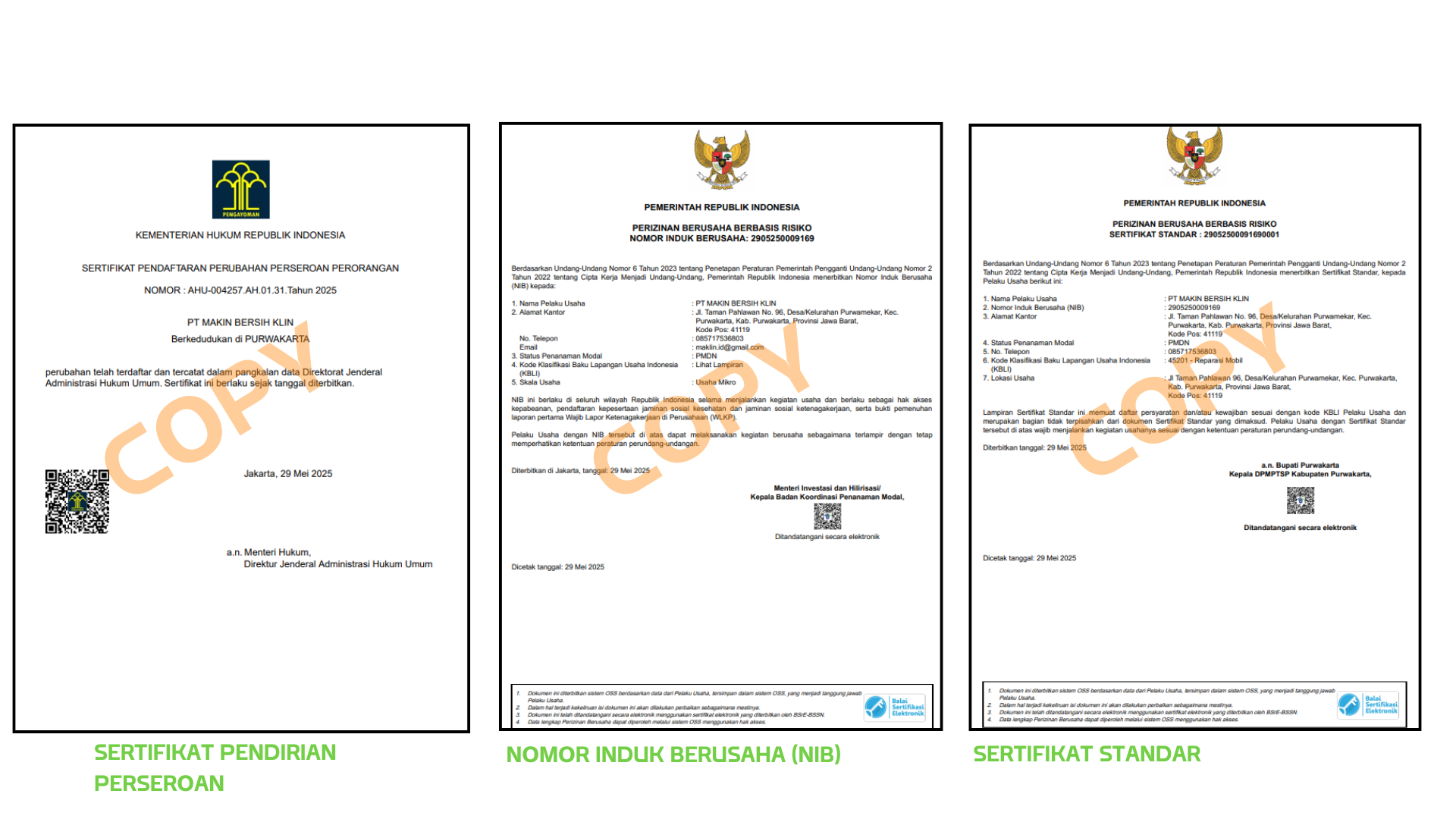 Dokumen legal perusahaan PT Makin Bersih Klin ("MAKLIN") menunjukkan kepatuhan, keabsahan dan kredibilitas sebagai penyedia layanan kebersihan profesional, serta MAKLIN beroperasi secara resmi dan memenuhi ketentuan hukum yang berlaku di Indonesia.
